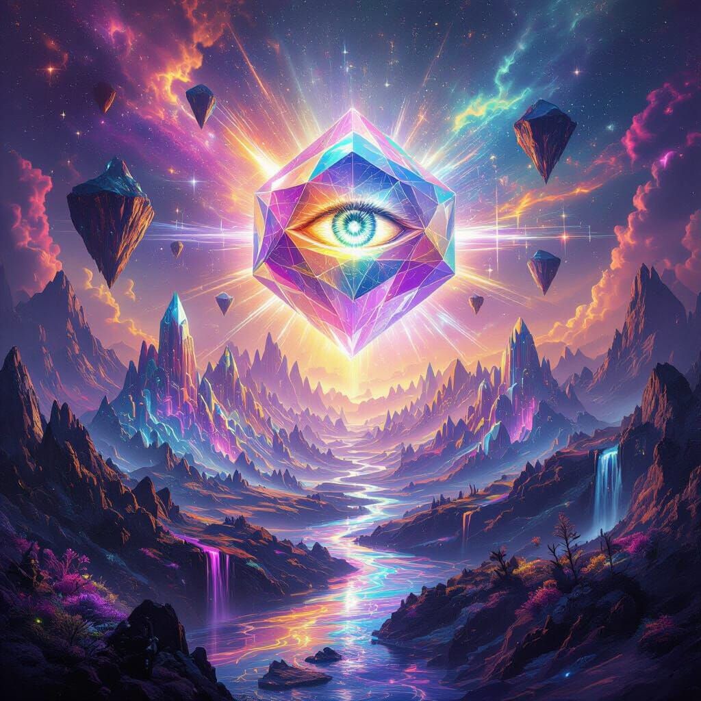 This image displays a fantastical landscape made of crystal prisms and glowing elements, featuring a cosmic eye structure and liquid rainbow rivers. It is rendered in a vibrant, hyper-saturated style with intricate light refractions.