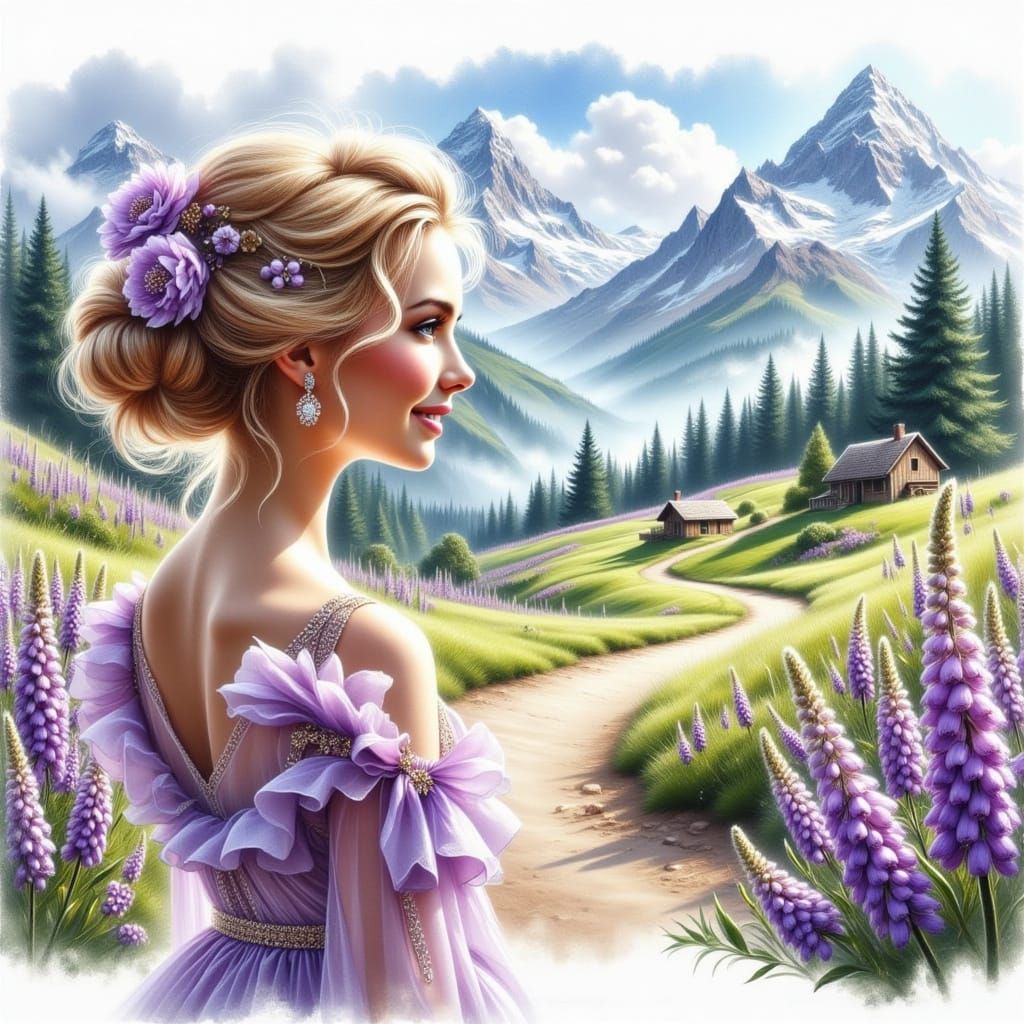 <lora:Lovely Touch:1.0> <lora:SuperHyperrealismFlx:1.0> <lora:Flax:1.0> en gros plan une belle jeune femme souriante chignon décoiffé , beau visage regarde the road is covered with flowers and grasses leading to the mountain , cottage , watercolor delicate flowers lilac violets and turquoise , Watercolor ...