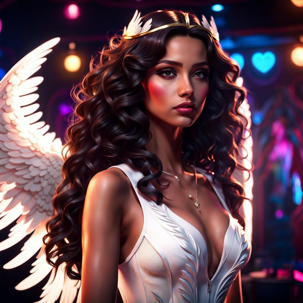 This image depicts a fair-skinned teenage girl with dark curly hair and angel wings in a nightclub setting. The digital painting features intricate details and complementary colors in an 8k resolution.