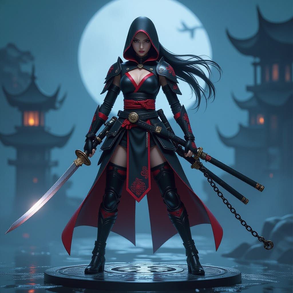 This image features a collectible action figure of an exotic female ninja assassin in black and crimson armor, wielding twin ninjatō swords and a chain-sickle. Presented with dramatic lighting and arcane mystery, in a digital art style.