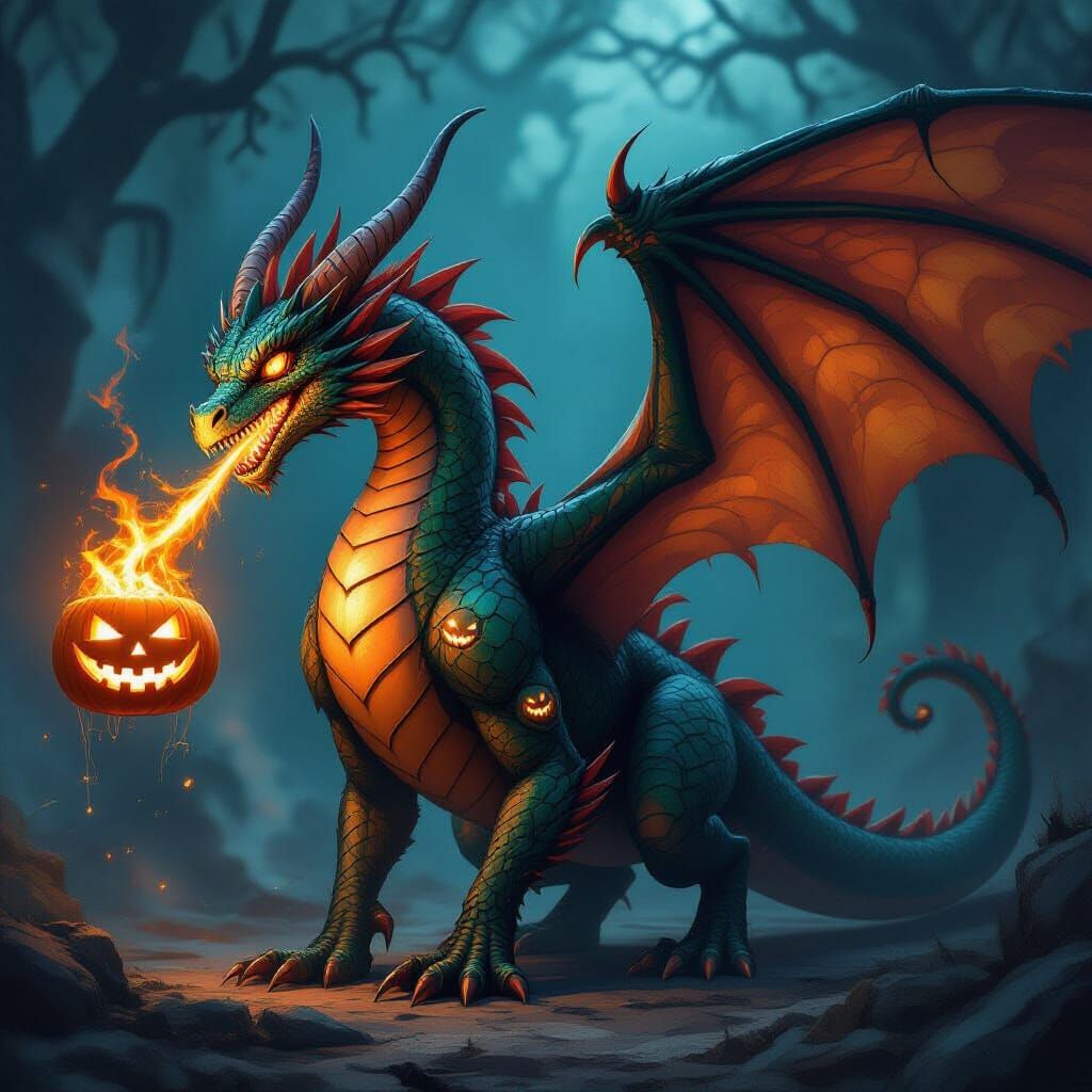 This dark fantasy concept art showcases a majestic, fire-breathing dragon with Halloween motifs. Dramatic lighting highlights its jewel tones and intricate details, evoking a sense of fantasy.
