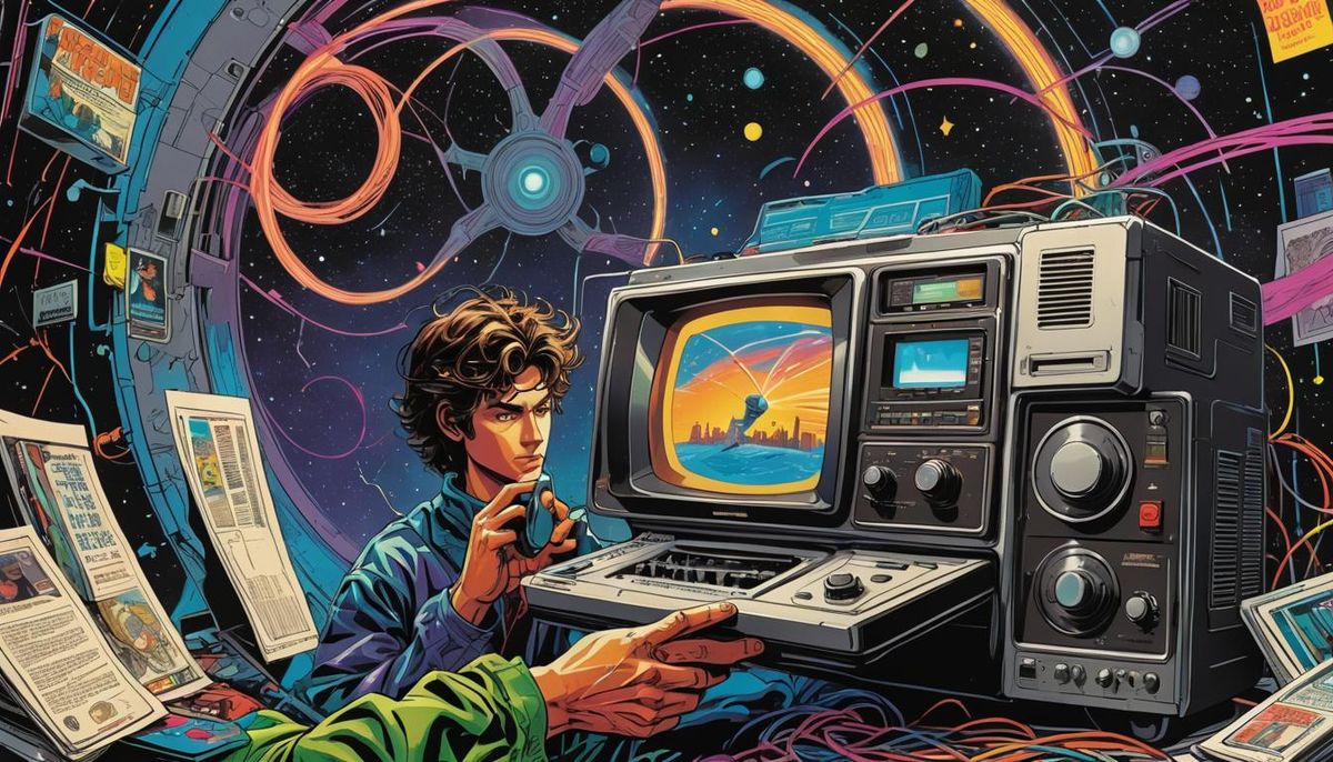 This image shows a person in an action pose holding a Walkman and a magazine, set in an 80s retro-futuristic comic book style. The artwork features vibrant colors, bold lines, and neon glows, with analog VHS distortion effects.