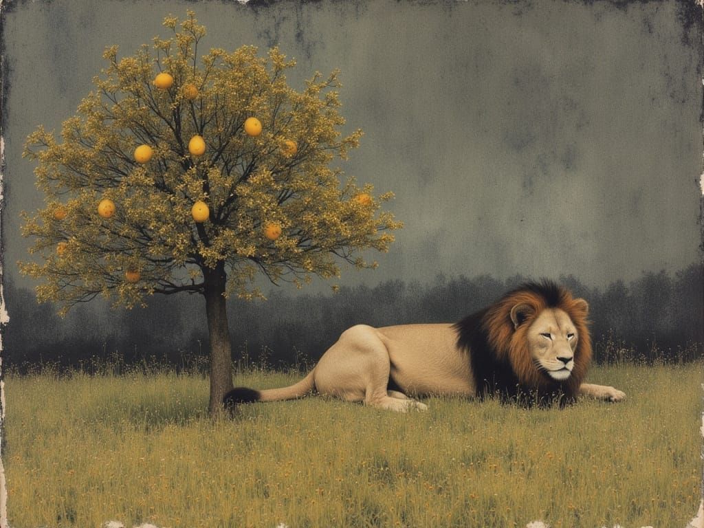 This serene watercolor-inspired scene features a majestic lemon tree, vibrant wildflowers, and a sleeping lion, evoking a sense of nostalgia and peacefulness reminiscent of Andrew Wyeth's style with hints of whimsy and ethereal quality