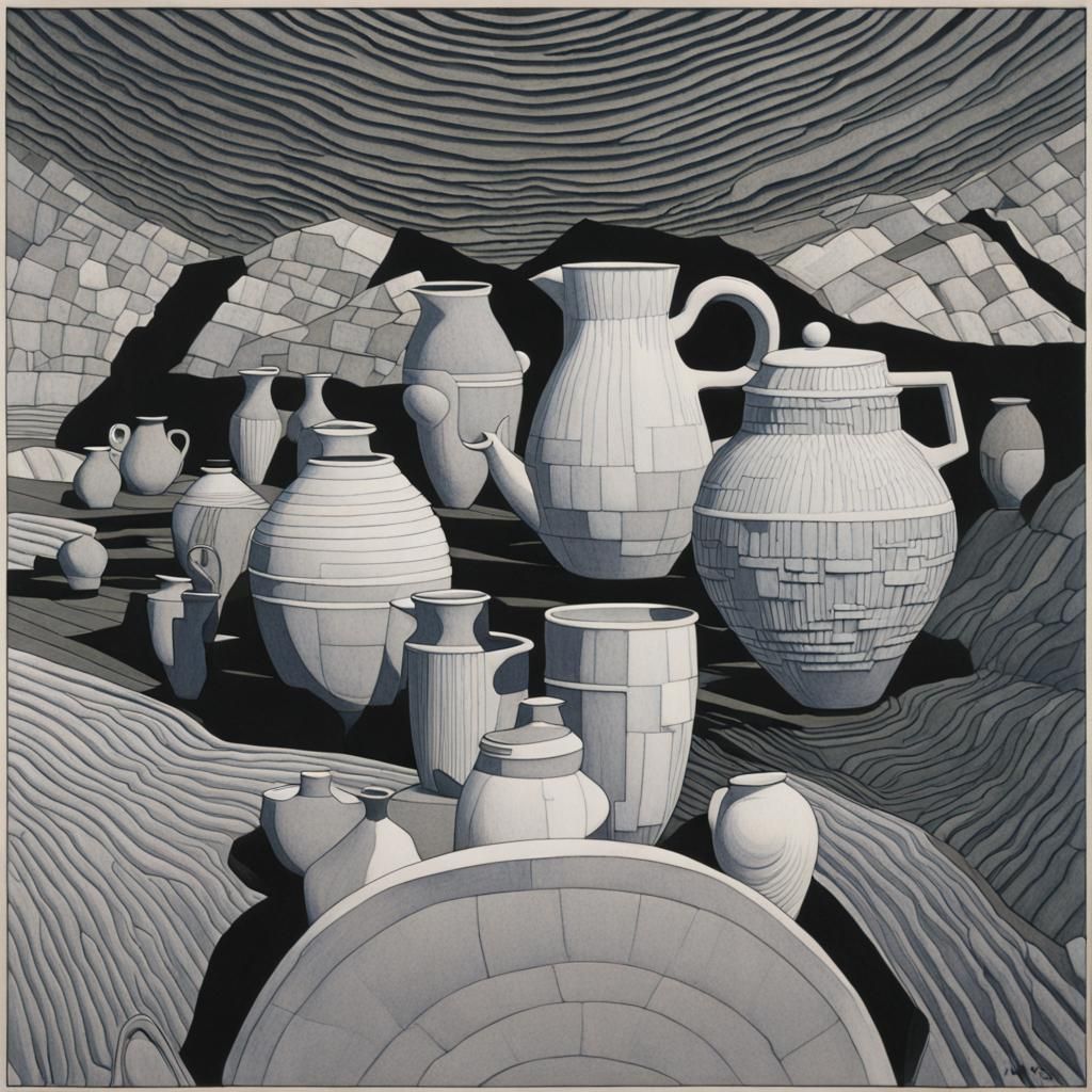 Create your own futuristic pottery art with our free AI image generator, inspired by Kawase, Monet and Syd Mead.
