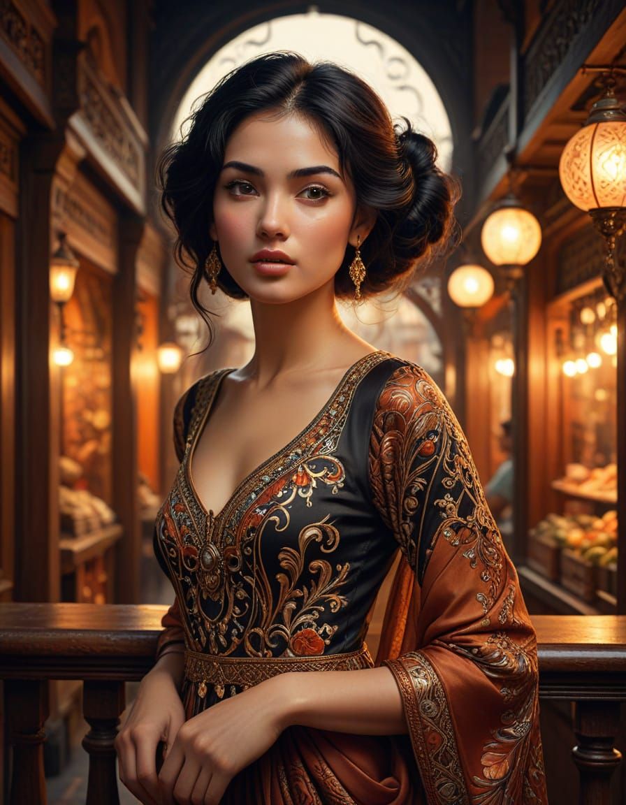This digital painting depicts a young woman with dark features and tanned skin, standing on a balcony overlooking a vibrant bazaar. Rendered in an Art Nouveau style with flowing lines and ornate details.