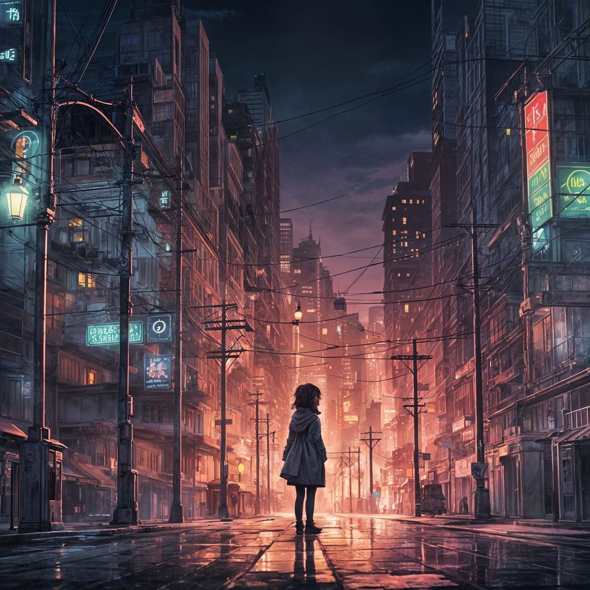This image depicts a sorrowful woman standing alone at the edge of a city. She is wearing a dark coat with cinematic lighting and soft watercolor tones, creating an emotional mood.