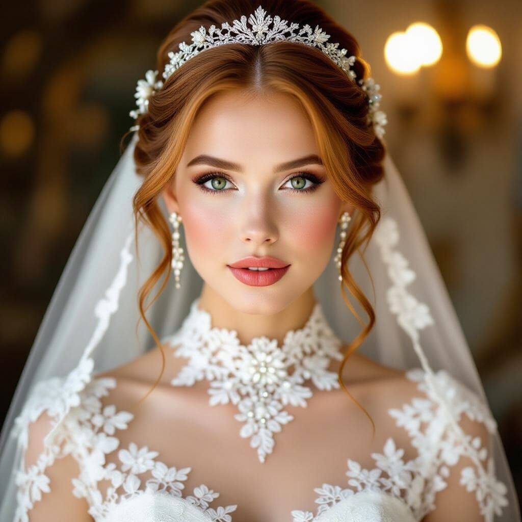 This image shows a beautiful bride in an elaborate updo and white lace gown. The ethereal and romantic aesthetic is inspired by Pre-Raphaelite art.