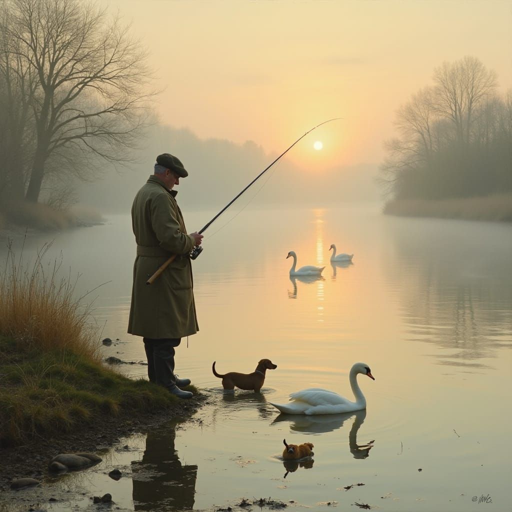 This image captures a tranquil river scene at dawn, with a lone angler standing on the water's edge, surrounded by swirling mist and serene wildlife, including swans and dogs, set against a warm golden light, evoking the peaceful essence of the moment in a dreamy, muted landscape