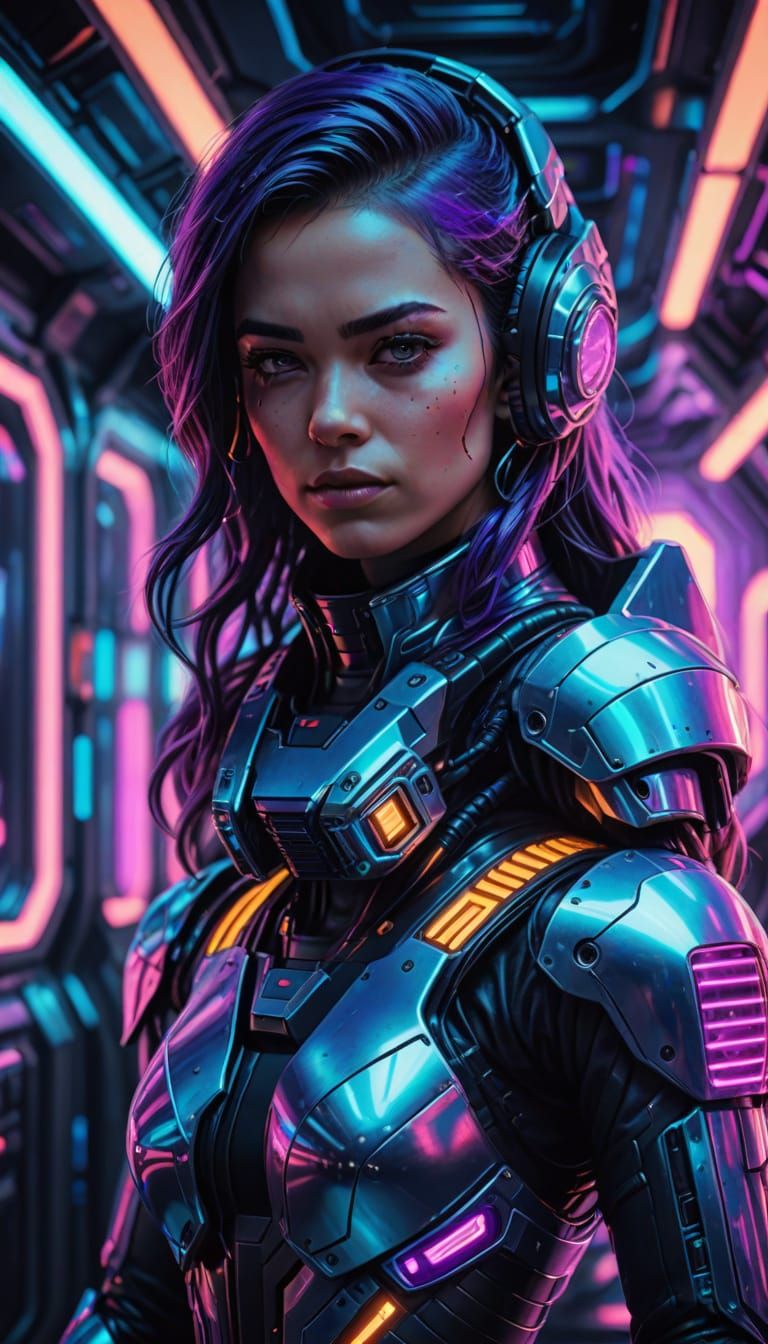 This striking portrait shows a woman in sleek, high-tech space gear, surrounded by the vibrant glow of a metallic spacecraft. Created in a futuristic sci-fi style with neon accents and bold lines, this image is a masterclass in detailed, high-contrast color and design.