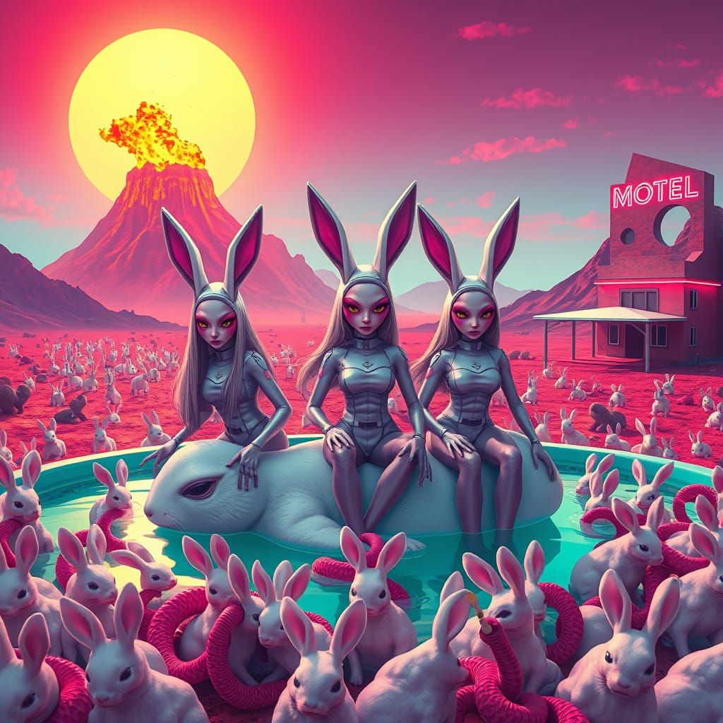 A striking picture of three angry alien women with rabbit ears and horns, floating on a white rabbit in a turquoise pool. The fantastical scene is reminiscent of digital matte painting.