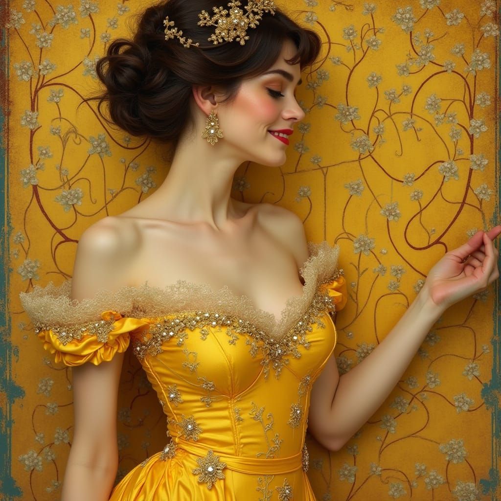 This image shows an elegant European woman smiling and wearing a fitted light yellow silk dress. The artwork is reminiscent of Art Nouveau styles with soft, bright lighting.