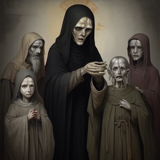 This image shows emaciated figures with hollow eyes, depicting disease and malnourishment in a medieval art style. Muted earthy tones with sickly green accents create a somber, haunting presence.