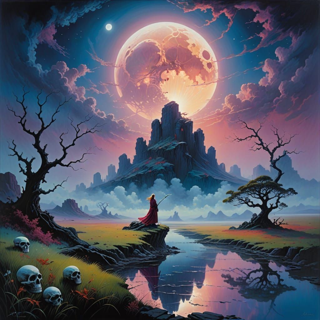 This mystical landscape features a hidden figure of a clothed woman and an ethereal woman standing amidst dreamy mist, with a glowing moon and scattered skull in the distance, set against a backdrop of soft, feathery clouds and vibrant, bold colors.