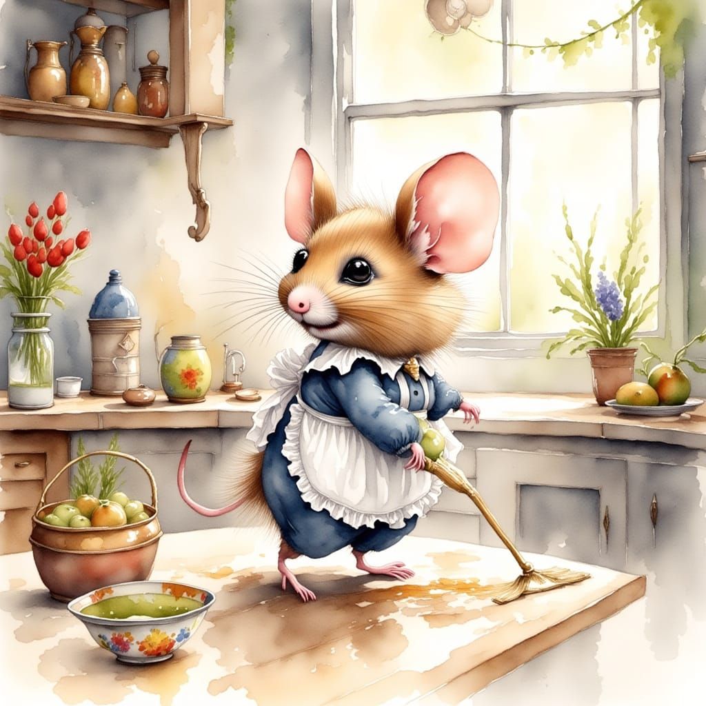 Mouse Maid Cleaning a Kitchen Counter while Everyone is Out for the Day
