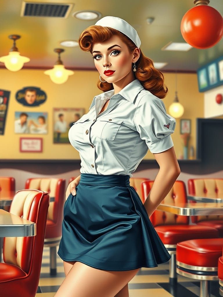 A vintage-style pin-up image shows a waitress in a 1950s diner. The artwork is reminiscent of classic mixed media pin-up art, using oil paint and watercolor techniques.