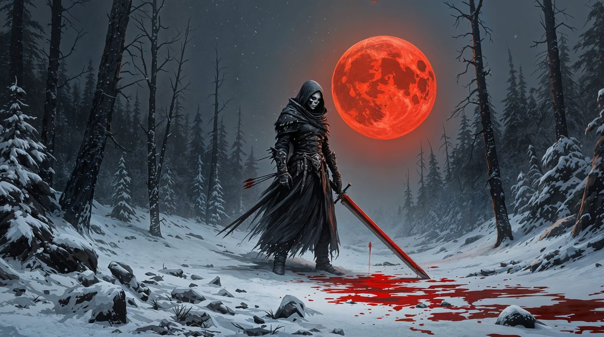 This image shows a powerful warrior woman standing strong in a desolate winter forest, surrounded by snow-covered trees and a blood-red moon. Her dark, textured garments and fierce posture evoke a sense of power and isolation.