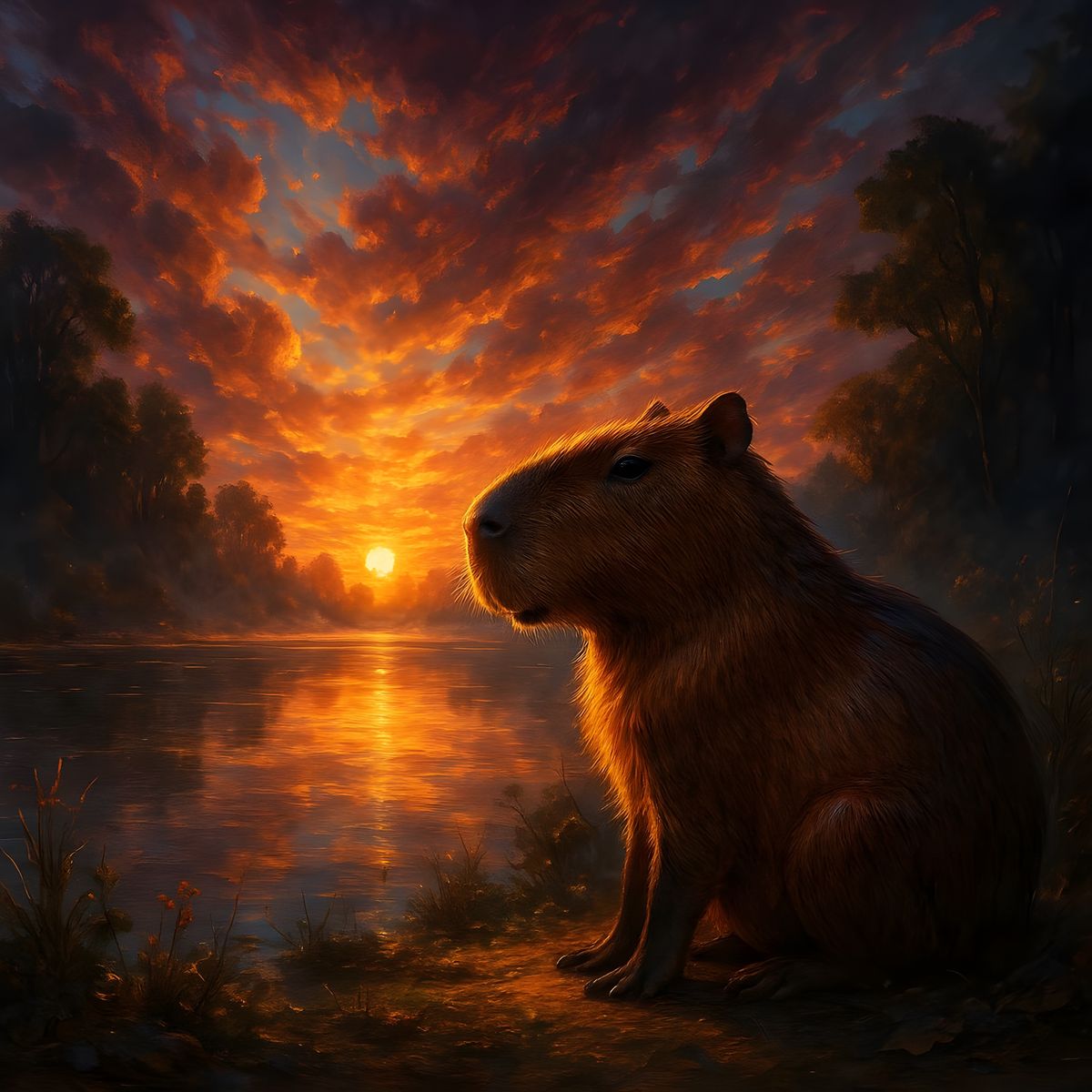 A digital matte painting of a capybara at a pond during a sunrise. The hyperrealistic image features intricate details, dramatic lighting, and a colorful background.