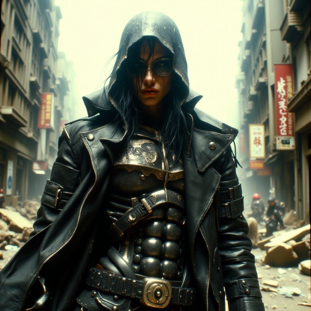 This image shows a cyborg assassin in a ruined city. The figure wears a leather jacket and sunglasses, with a metallic endoskeleton visible, rendered in a gritty, high-tech science fiction aesthetic.