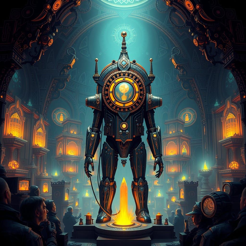 This image shows an intricately designed Art Deco automaton with a metallic sheen, guarding a treasure chamber filled with glowing artifacts, rendered in a pop art style with triadic colors.