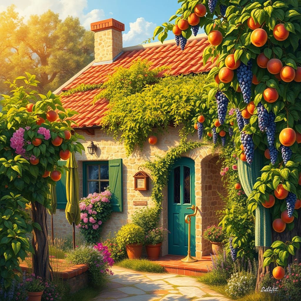 A serene, rustic cottage nestled among lush greenery, vibrant flowers, and fruit trees, bathed in warm, golden light, reminiscent of Impressionist masterpieces