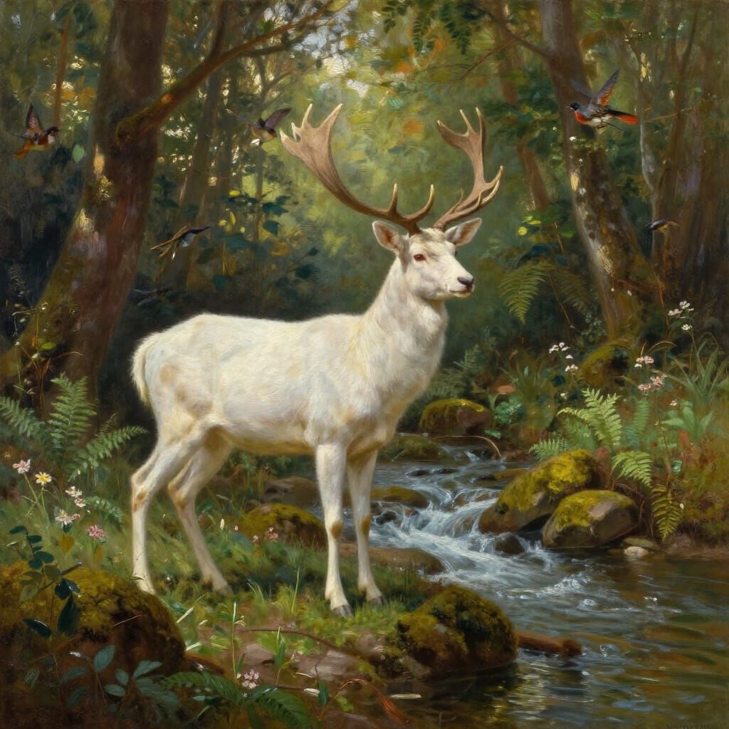 An oil painting of a majestic white stag in a sunlit forest, beside a clear stream. Features lush greenery, dappled light, and birds, evoking serenity. Rendered with rich, textured brushstrokes in a classical style.