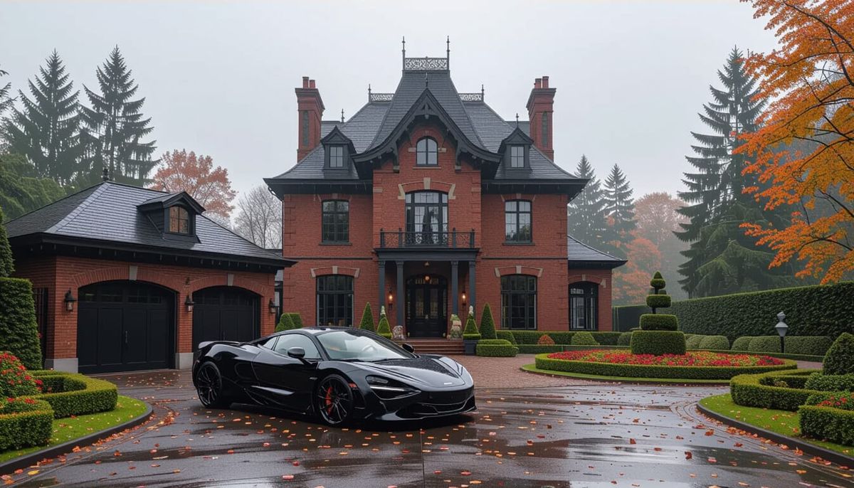 This image features a grand Victorian chateau with a McLaren 720S parked in front, surrounded by vibrant trees and a flower garden under a rainy sky. Captured with a painterly, realistic style.