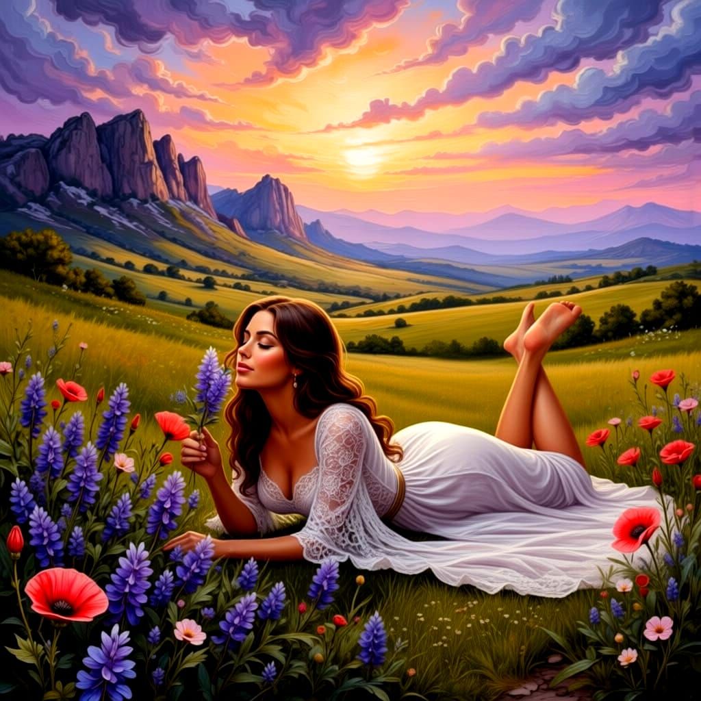 In the middle of the field stands a woman taking in the moment, steady and unbothered by the storm around her. Her lace garment moves with the wind as she stands grounded in the grass, fully present in the wild energy of the scene. The storm rolls, the flowers sway, and she remains calm at the center of it all like the field recognizes her as part of its rhythm.