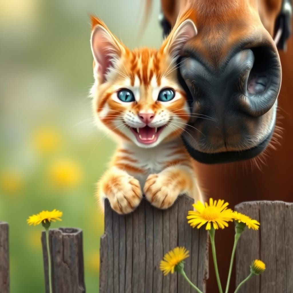 A heartwarming image of a playful orange tabby kitten and a chestnut horse standing together, surrounded by soft colors and whimsical textures, evoking a sense of warmth and friendship.