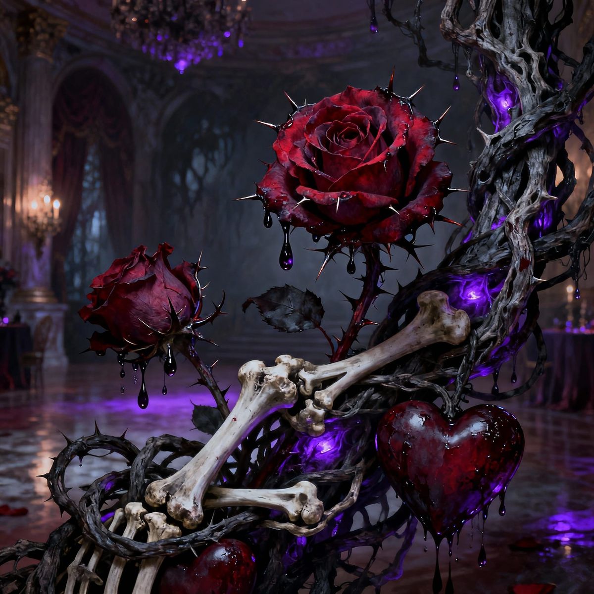 This dark fantasy illustration depicts a spooky Valentine's Day with roses and hearts entwined with thorny, skeletal vines. Deep crimson and charcoal tones create a hauntingly elegant gothic romance.