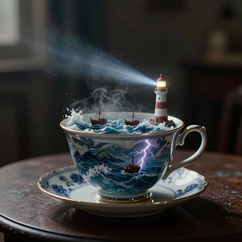 This hyperreal image shows a porcelain teacup containing a miniature stormy ocean with ships and lightning. A tiny lighthouse on the rim beams light, creating a cinematic, atmospheric scene.