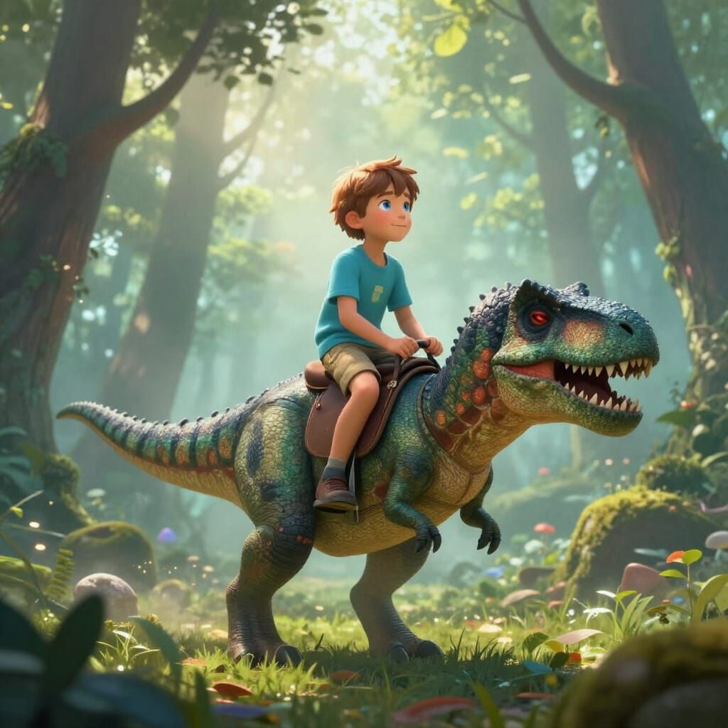 This image shows a young boy with light brown hair and blue eyes, riding a T-Rex through a misty forest. The scene features ethereal, glowing light, creating a sense of wonder.