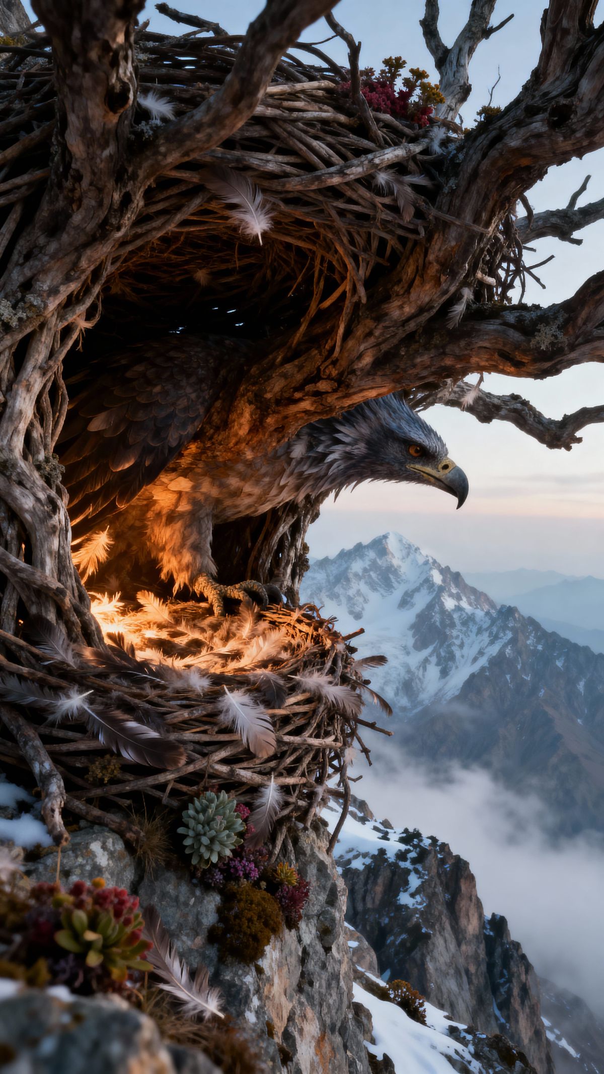 This image depicts the vast, empty nest of the mythical Simurgh, woven from ancient branches and flora. It's an otherworldly, warm cradle on a mountain peak, rendered in cinematic realism with detailed textures.