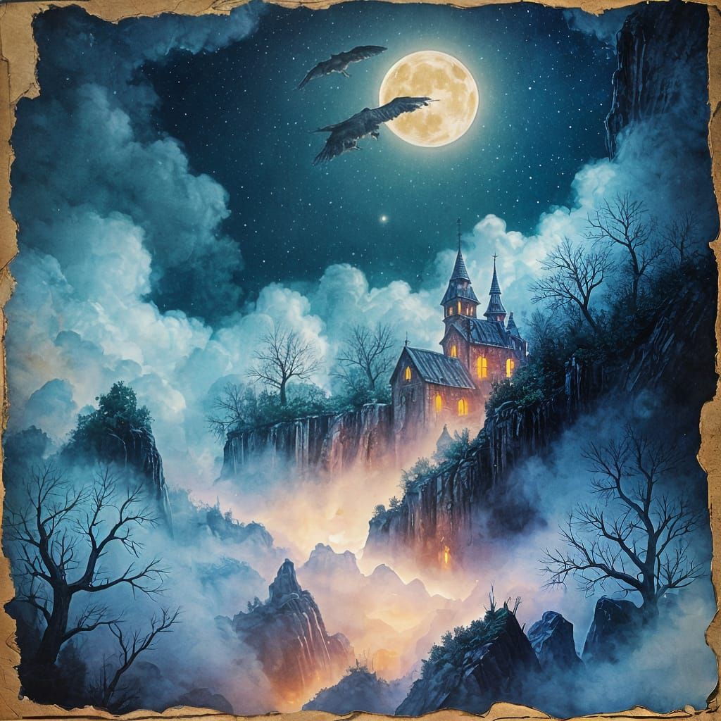 This image shows a detailed storybook illustration of a mystical lost land, complete with fog, moon, and otherworldly elements. The artwork features vibrant colors and a luminist style in watercolor.