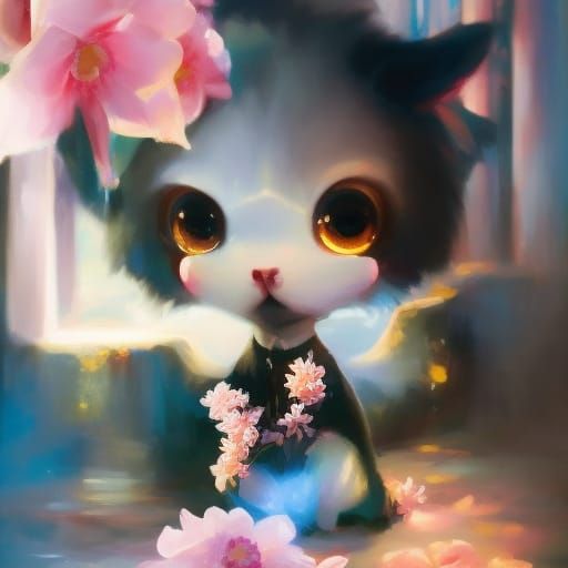This image shows a cute, sorrowful pig with large eyes, encircled by hearts and flowers. The artwork evokes the style of a vibrant digital illustration with dramatic, volumetric lighting.