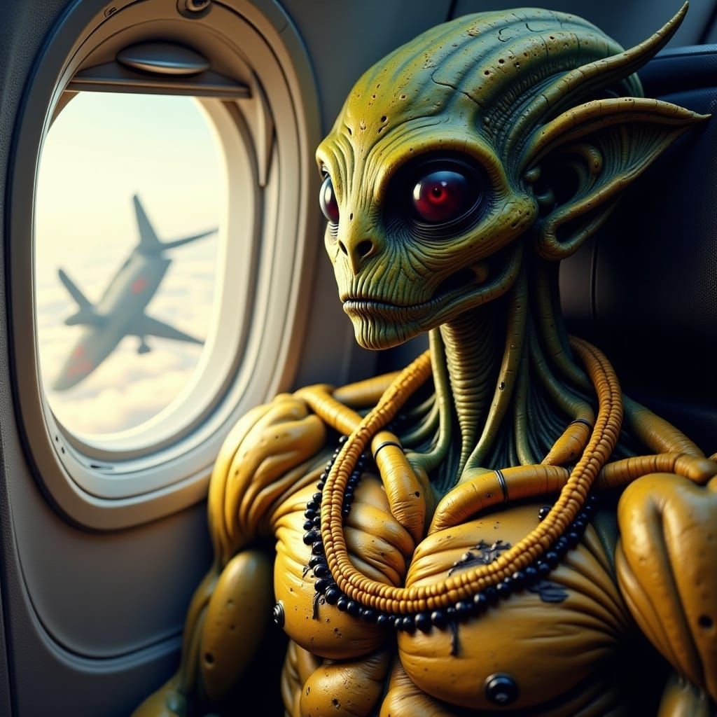 Large first-class plane window reveals something. About 50 ft from the wind is an alien body builder. Alien head is large like a stick of corn. It is wearing a necklace of corn. There's black beans and squash tattooed on it's chest.