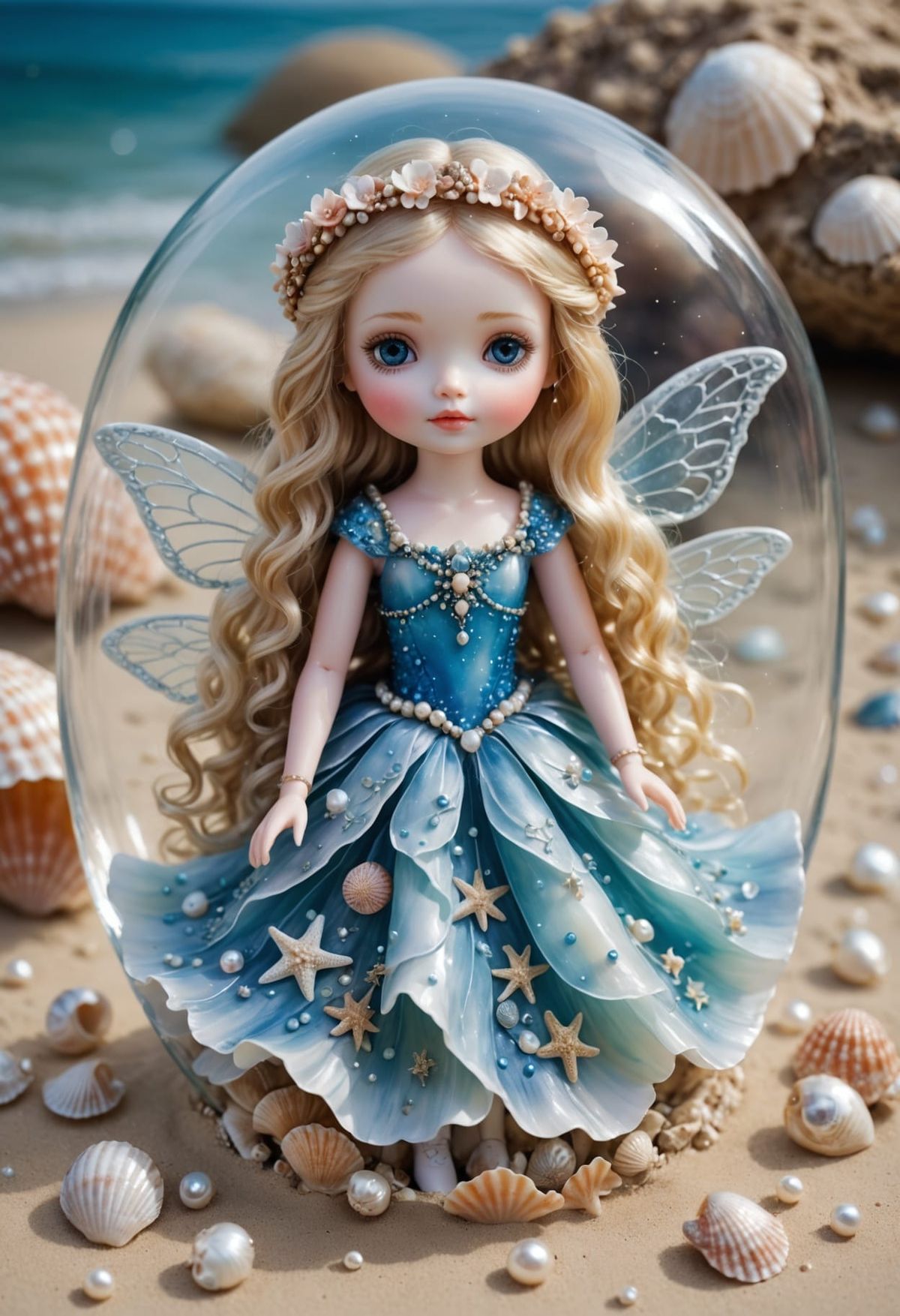This image shows a delicate porcelain fairy doll with translucent wings, sitting inside a giant clamshell surrounded by pearls. The scene is a whimsical digital art piece with soft, dreamy colors.