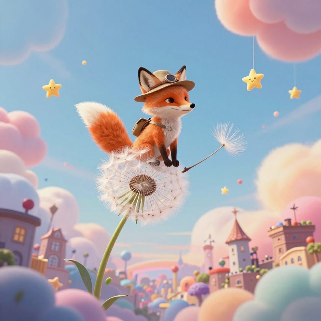 This image shows a charming fox adventurer on a dandelion seed, floating above a surreal, upside-down city. It features candy-colored clouds and a dreamlike storybook illustration style with a vibrant palette.