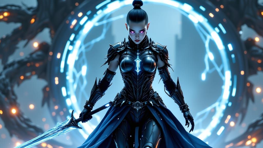 This image shows a female warrior stepping through a glowing portal into a futuristic cityscape. She wears high-tech black armor and wields a sword with an electric blue blade, illuminated by neon lights.
