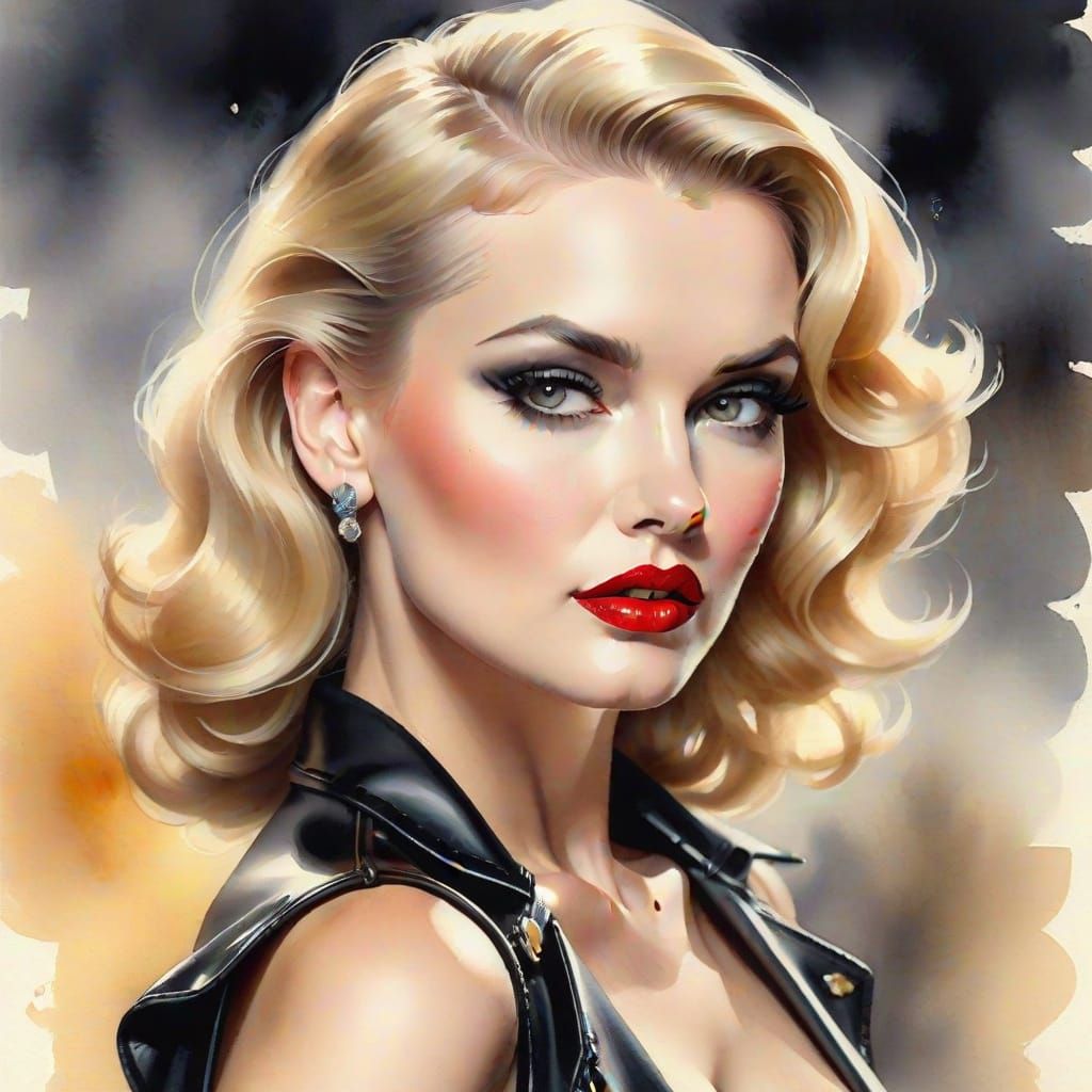 This elegant watercolor portrait features a woman in black leather, with smoky eyes and red lips, set against a soft focus background in pastel colors, exuding glamorous sophistication
