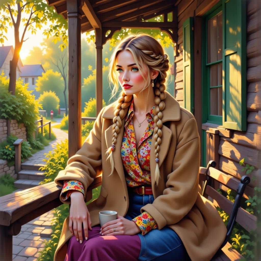 This image depicts a woman with blonde braided hair, wearing a warm coat and colorful blouse, seated on a rustic house porch. Bathed in golden hour light, it features vibrant colors and a painterly, impressionistic style.