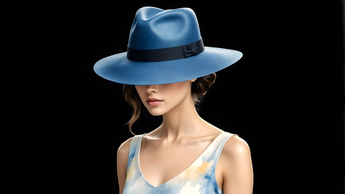 This image captures a refined woman with a partially hidden face, set in a serene watercolor scene with soft blues and delicate brushstrokes, creating a sense of whimsy and romance.