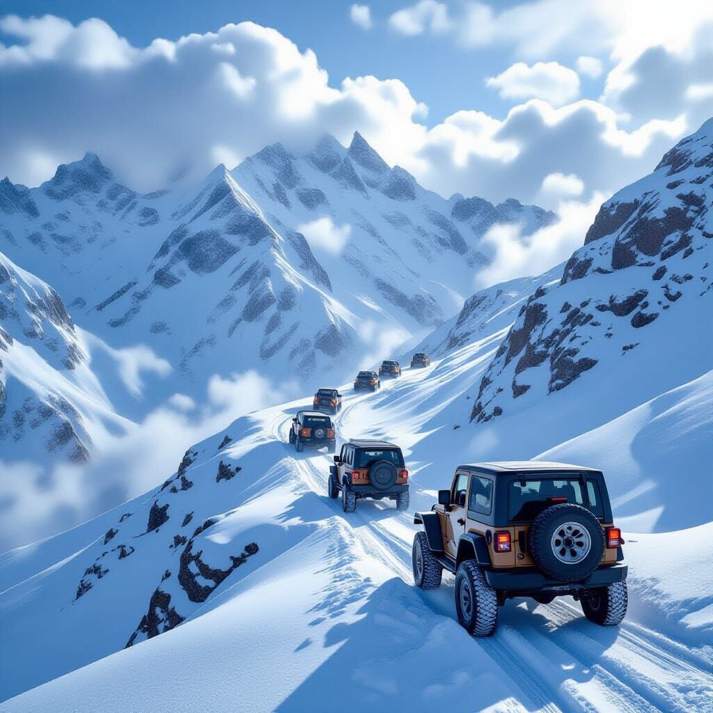 This image showcases a convoy of jeeps navigating snow-covered mountain peaks. Dramatic clouds fill the sky, creating a cinematic and adventurous atmosphere.