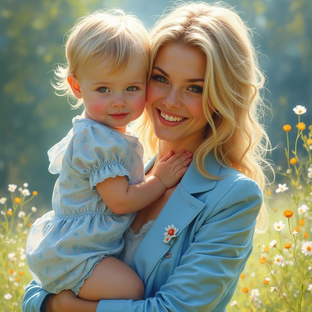 A warm and vibrant painting of a smiling mother in a light blue dress with floral patterns, holding her child in a soft and natural light, reminiscent of Impressionist masters.