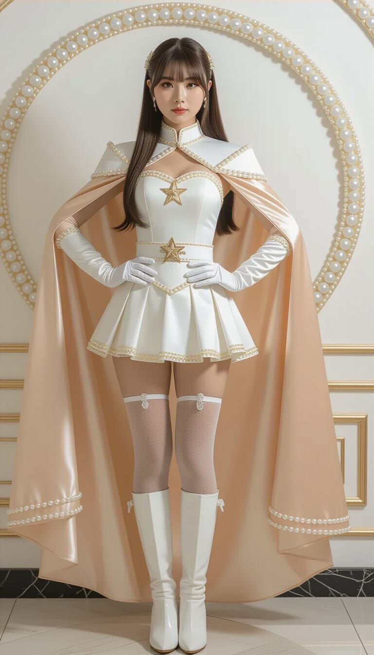 This image shows a Chinese college student transformed into a superheroine. She wears a pearl-covered, high-tech suit with a pearl milk tea-colored cape, rendered in a dynamic comic book style with bold lines and vibrant colors.
