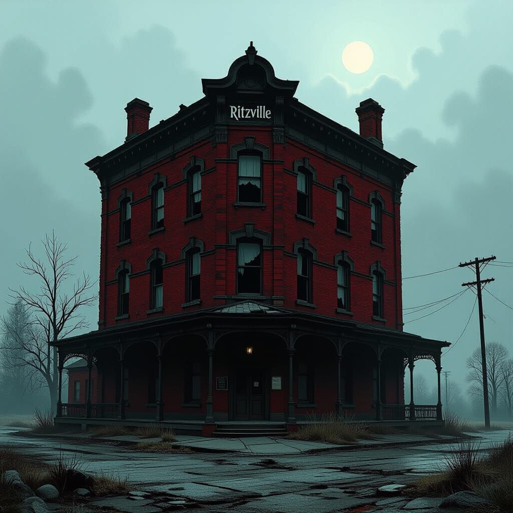 This image depicts the abandoned four-story red brick Ritzville hotel, built in 1902. Rendered with textured, moody brushwork and dramatic lighting, it emphasizes unsettling decay and gothic grandeur.