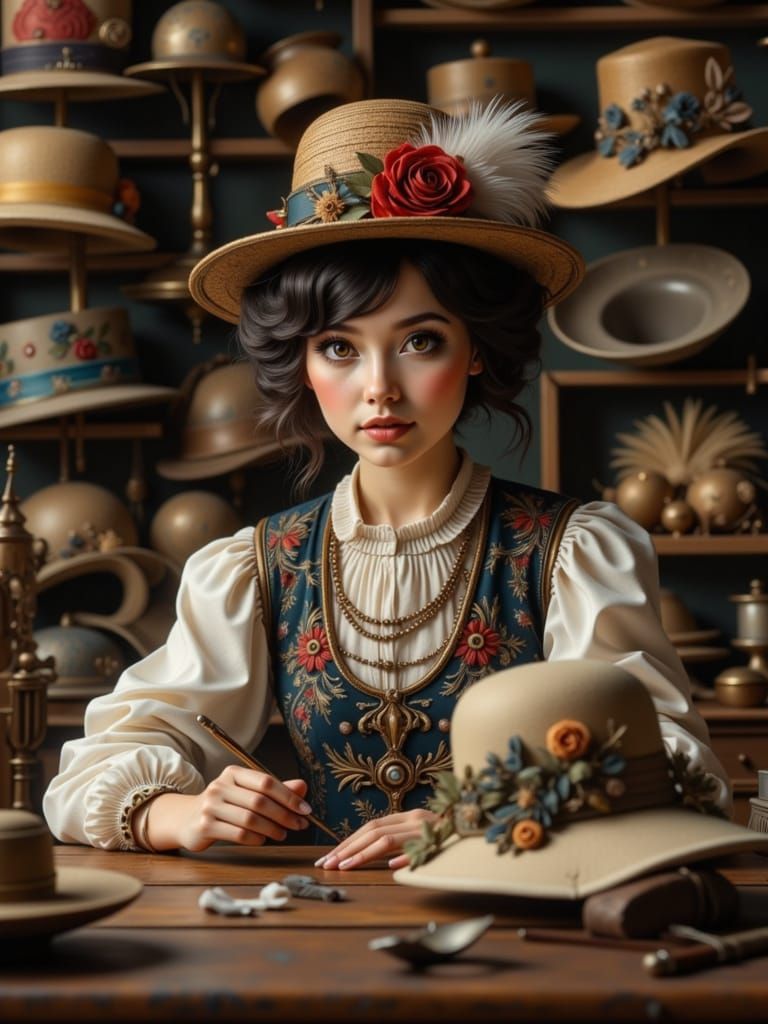 A photorealistic image of a young artisan focused on hat making in a vintage steampunk workshop. Cinematic lighting highlights intricate details and a storybook atmosphere.