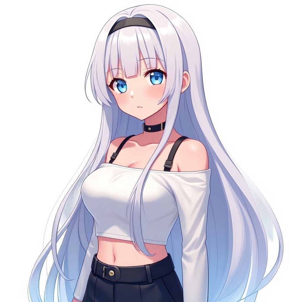 This image features a beautiful anime girl with white hair and striking blue eyes, depicted in high quality with the full subject in frame.