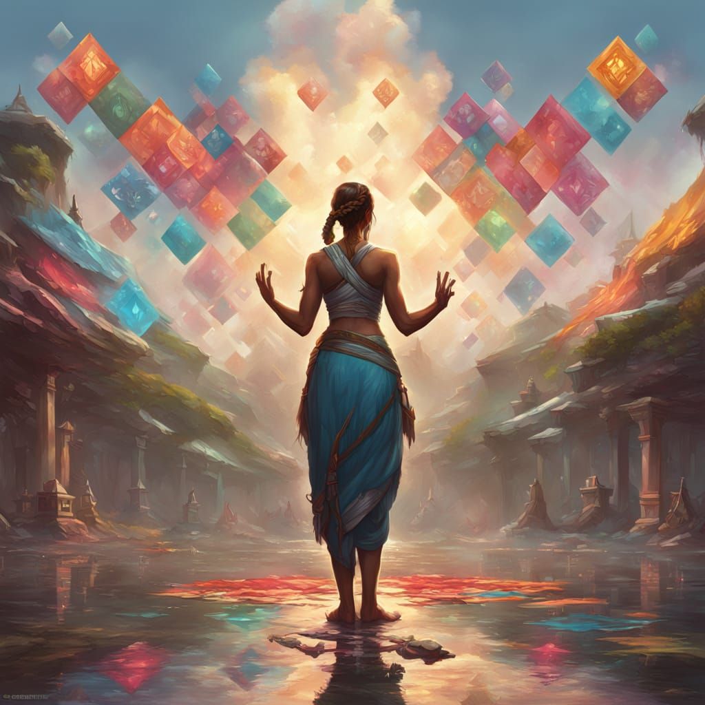 This image depicts a woman seated in a yoga lotus pose, with vibrant, colorful threads emanating around her like smoke. It is rendered in a dynamic, concept art style with striking lighting.