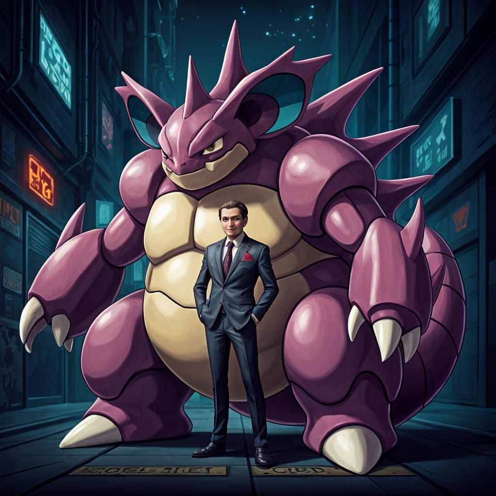 A digital rendering of Team Rocket Boss Giovanni and his Nidoking, set against a blurred background. The artwork evokes a sense of power and ambition.