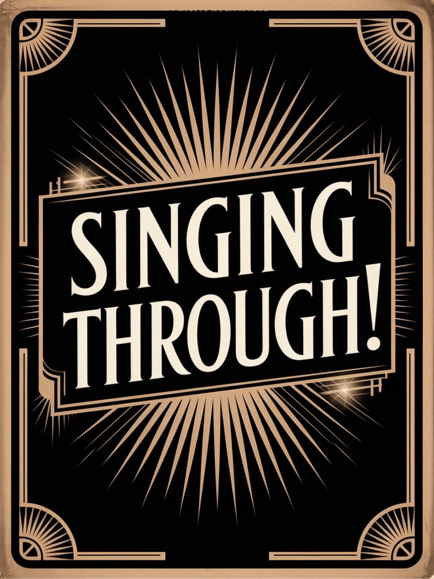 A vintage film poster in sepia tones features the title "Singing Through!" in Art Deco typography. The image evokes the glamour and entertainment of 1930s cinema.